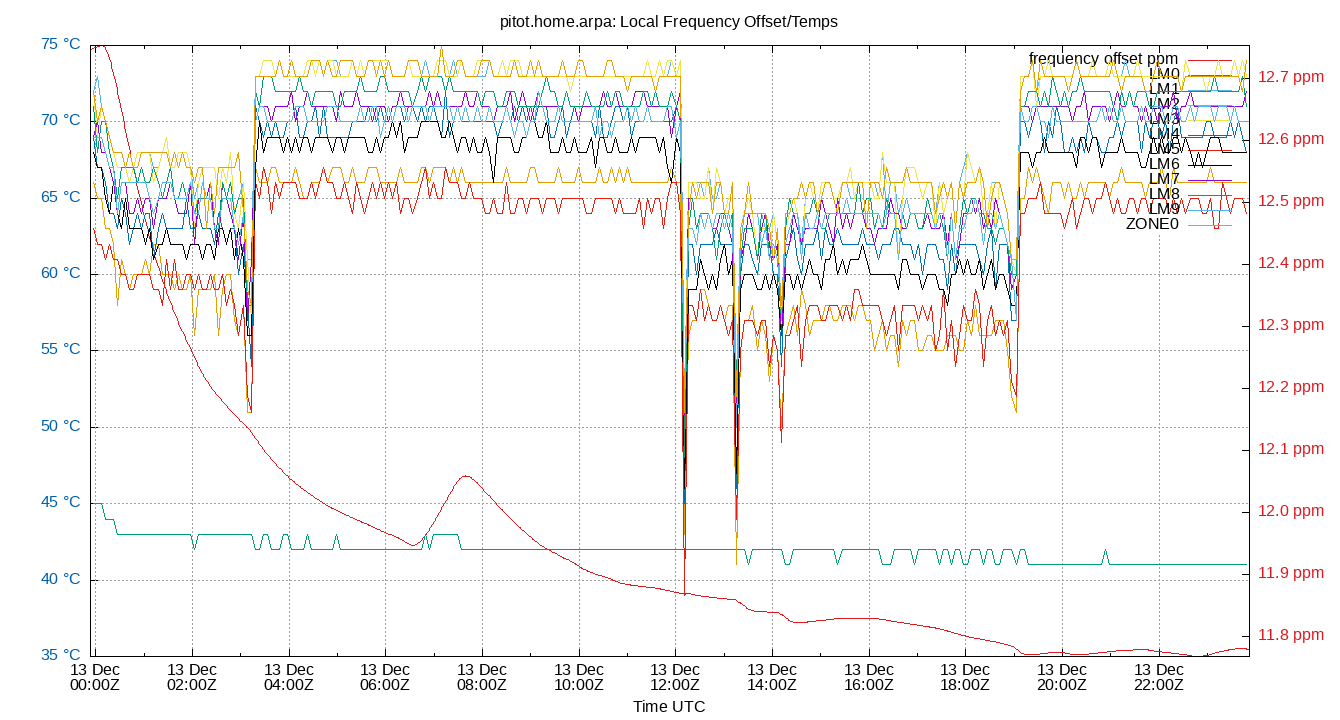 The frequency offsets and temperatures. Showing frequency offset (red, in parts per million, scale on right) and the temperatures.